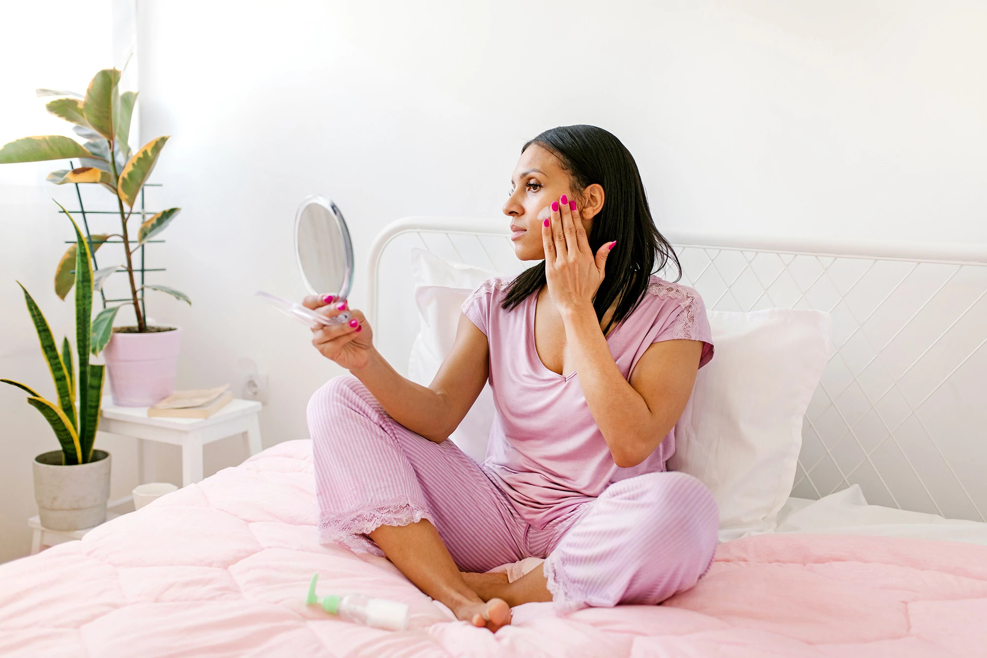 Choose a lightweight serum, preferably one with vitamin C as part of your morning routine. Kemunto Mokaya, M.D., a board-certified dermatologist from Houston, says, “Vitamin C is safe for most skin types and is useful because it is an antioxidant that fights the effects of free radicals such as those from UV radiation. It promotes collagen production, is a skin brightener that evens out the complexion and reduces hyperpigmentation, hydrates the skin and reduces redness.”